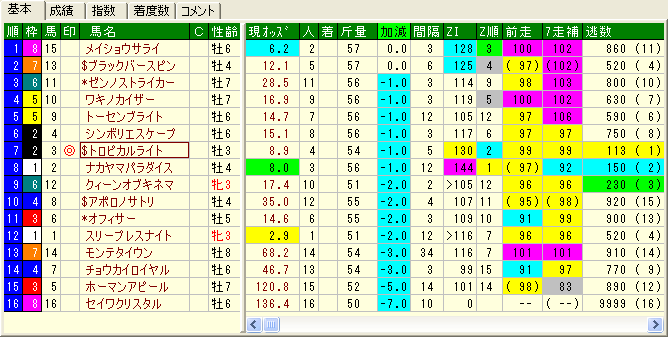 | 枠 | 馬 | 馬名 | 性齢 | 替 | 騎手 | 斤量 | 間 | ZI | 直前 | 芝短 | 芝中 | ダ短 | ダ中 | 脚質 | 逃数 |
