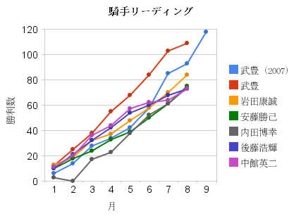 内田博幸がとうとう関東リーディングに立ちましたね。4月終了時点では中館英二との差は21ありましたが、4ヶ月で逆転しました。さすが地方競馬ナンバーワンジョッキーですね。まだ、取りこぼしが多いけどコースに慣れてくればもっと勝ち星を量産するでしょうね。騎手リーディングは武豊が2位の岩田康誠に21差つけているので怪我でもしない限りほぼ決定。2位も岩田康誠で決まりかな。となると3位争いですが、騎乗数の多さから内田博幸が逆転すると思う。年間100勝騎手は騎乗数の多さと勝率から藤田伸二までの9名にチャンスがあると思う。注目の新人・三浦皇成ですが先週は勝ち星がありませんが、4ヶ月で19勝すれば武豊の持つ新人記録を抜くことになる。これまでの活躍をみると記録更新は間違いないところまで来ているが、ここからが試練ですね。秋のG1シーズンになると新人には苦しい時期ですから。