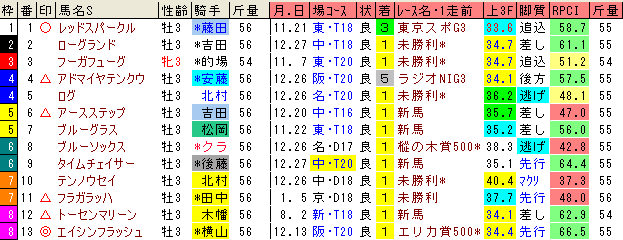 京成杯ですが、レース経験の少ない馬が多いですね。未知の魅力もありますが、ここはレース経験のあるエイシンフラッシュを本命にした。未勝利勝ちしたレースではレッドスパークルに競り勝ち、萩Sではコスモファントムのコンマ5秒差、エリカ賞ではアパパネといい競馬をしたブルーミングアレーに競り勝っている。萩Sではハイペースを、それ以外ではスローペースを経験。特に萩Sは厳しいレースだったのでそれを経験しているのはいい。逃げるのはログだと思うけどスタートの上手くて積極的な競馬をするクラストゥスがブルーソックスに騎乗するのでテンは少し忙しいかも。ゆるゆるだと前残りもありそうだが、前にとってキツイ流れになりそうなのでそういう意味でもエイシンフラッシュがいいと思う。