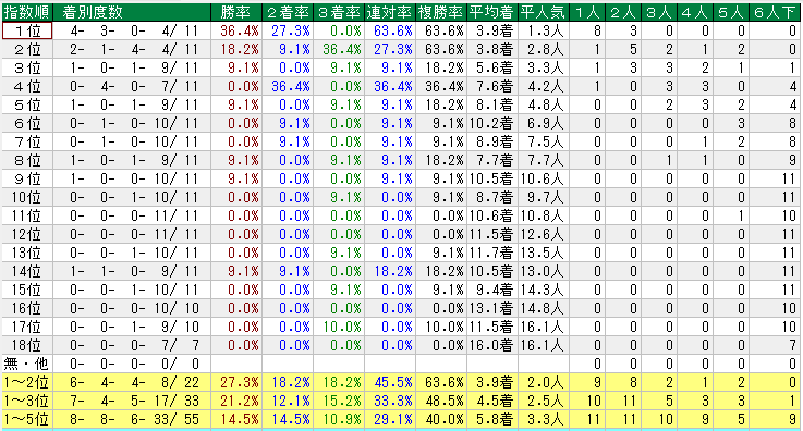 コンピ指数順位の成績をみると指数1位は4-3-0-4、指数2位は2-1-4-4、指数3位は1-0-1-9、指数4位は0-4-0-7と指数1位と2位の成績はいいですが、3位が悪いですね。配当を見ると指数1~5位までで決まったレースが4回、指数1~5位2頭+指数6位1以下1頭で決まったレースが4回、指数1~5位1頭+指数6位以下が2頭で決まったレースが2回、指数6位以下3頭で決まったレースが1回ありました。指数40台の馬が5頭も来ているのでその時はあれていますね。特に2011年以降は指数下位の馬が好走するケースが多いようです。