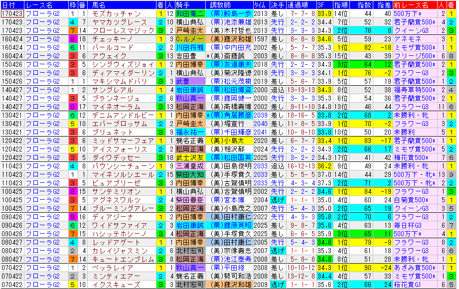 昨年は指数44、指数順位14位、12人気のモズカッチャンが勝ち、2着に指数52、指数順位7位、10人気のヤマカツグレース、3着に指数76、指数順位2位、2人気のフローレスマジックで、配当は3連複で35,790円、3連単は397,370円と高配当が出ました。近年は指数下位の馬が3着以内の来るケースが多いですが、それは中山開催からの開催替わり、3歳牝馬限定戦、オークストライアルなど複数の要因があるからだと思います。